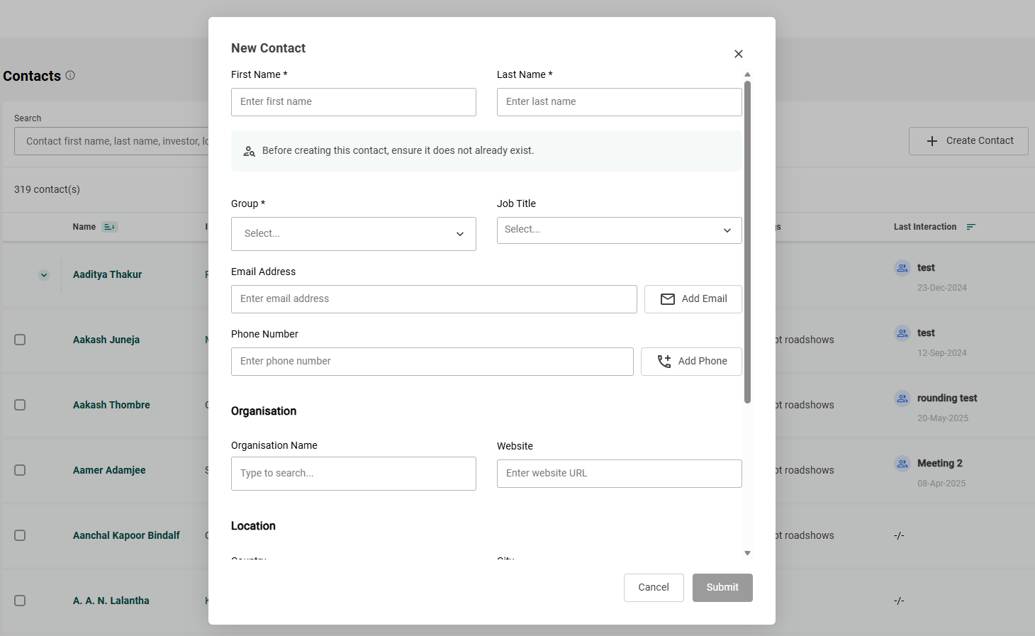 - Otherwise, complete at least the required fields (First Name, Last Name, and Group). It is recommended that you add some others such as the Organisation Name (in which your contact works) if you have the information. Have in mind that the more information you record, the more complete the profile of the contact will be: