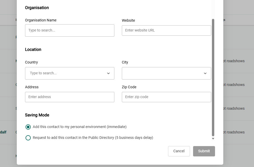 - When you have completed all the information, you can choose, under “Saving Mode”, to either save the profile as it is, or to request it be added to the Public Directory. In the second case, FactSet will research the contact and potentially add any relevant data they find on this person.