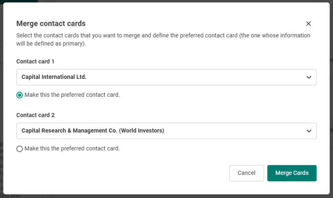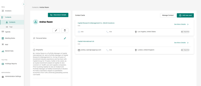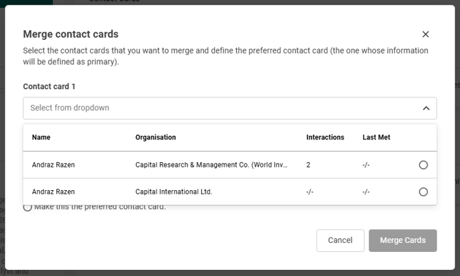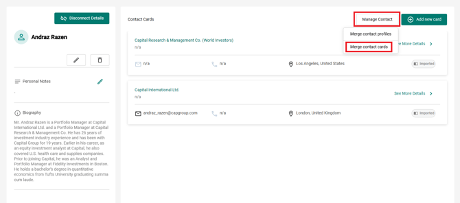In the screenshot below, the Contact profile of Andraz Razen has two Contact Cards: one at “Capital Research & Management Co. (World Investors)” and one at “Capital International Ltd.”: The Contact profile shows two Contact Cards for two different companies