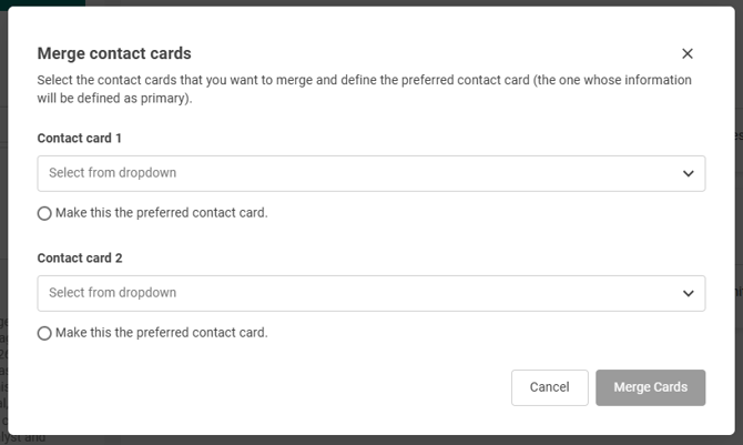 You have to select a value for both options Contact Card 1 and Contact Card 2. Here, you must select the Contact Cards that you want to merge and define the preferred Contact Card (the one whose information will be defined as primary):