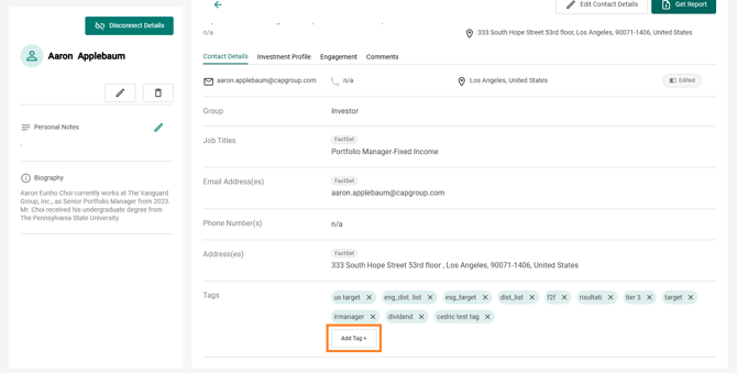 All your Tags will appear in the Tags area of the profile. To remove a Tag from a contact, just click on the small cross next to the Tag’s name.